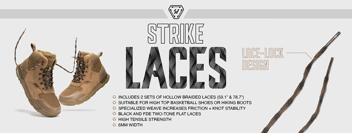Step up your game with Strike Laces. Strike Laces come with two sets of hollow-braided laces designed for high-top sneakers and boots, measuring 59.1 and 78.7 inches. Built to withstand extreme conditions, the black and FDE strands feature a specialized weave pattern that enhances knot stability while delivering a tactical look and feel. |