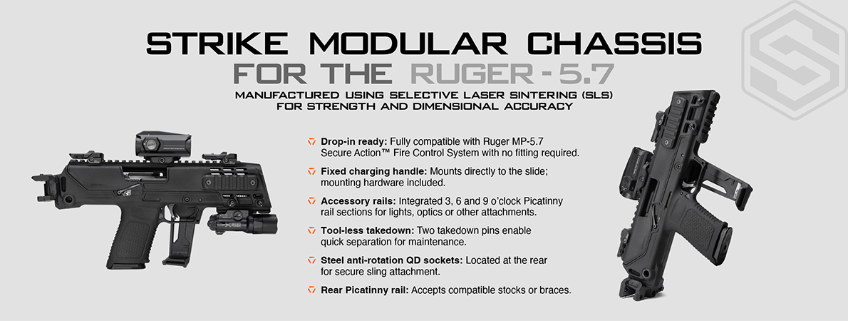 DISCLAIMER: We are not lawyers and cannot give any legal advice. Users must be aware of federal, state, and local laws. The Strike Modular Chassis (SMC) by Strike Industries is NOT A FIREARM. This is a grip module/chassis system made to work with the Ruger MP-5.7® series. Users will have to supply their own complete Ruger MP-5.7® slide w/ barrel, SAFCS, and magazine(s). The SMC – Ruger MP-5.7® is not a serialized product.